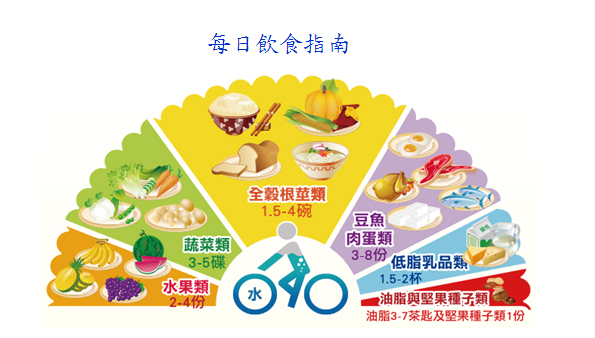 2、攝取均衡的飲食: 從每日飲食指南的六大類食物裡選擇(如下圖),食材選擇以少油鹽糖、高纖為原則,以獲取充足的營養素。部分報告指出足夠的維生素C、葉酸或鋅,可以降低牙周病的風險;維生素 A、E、β-胡蘿蔔素及蛋白質與牙齦組織和免疫系統提升的完整性有關;適當的鈣質和維生素D可防止骨質流失引發牙周病。