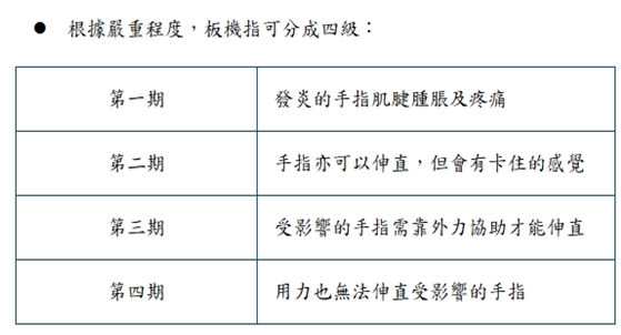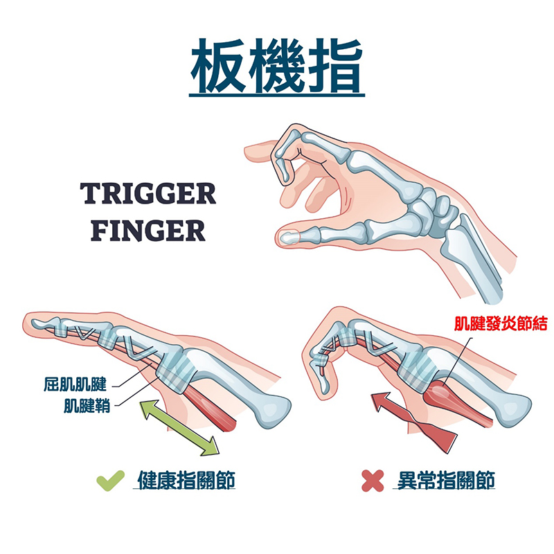 板機指是指手指屈肌肌腱在手指頭基部形成結節,使手指指節在彎曲而想伸直時會卡在手指的橫向韌帶,以致無法完全伸直,當用手去扳動時會像扣板機的情形突然彈起,故稱之為板機指,又稱為狹窄型腱鞘炎。(如圖一)