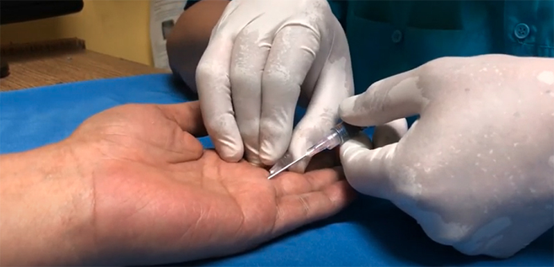 (5) 經皮穿刺療法,在消毒無菌下進行的手術使用針頭治療受影響的腱鞘組織。外科醫生首先將對該區域進行局部麻醉。然後,醫生將使用針頭(通常為18G針頭)刺入皮膚去釋放A1滑車。因為此手術並沒有切口,所以在進行該手術後,就不需要縫合。與傳統的開放式手術相比,這種替代方法的恢復期較短,患者能更快重回崗位,但保養不好復發機率高。(下圖示)