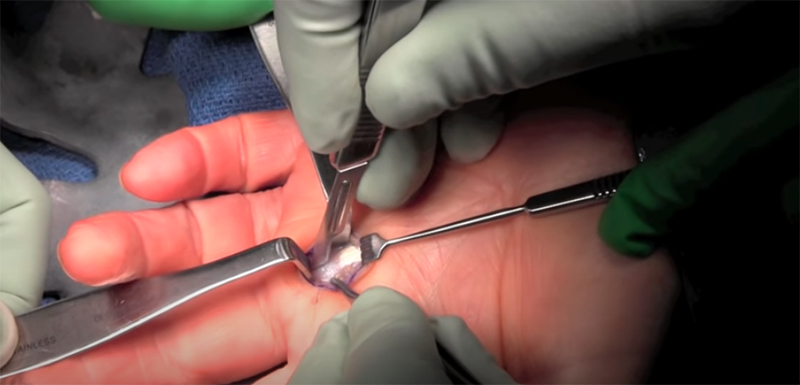 醫生首先會進行局部麻醉,在手掌開一個小切口( 手部A1 區) ,醫生會找出影響會肌腱鞘纖維節結,然後小心地將其切開,使肌腱得以滑動。在縫合前,醫生會嘗試彎曲及伸直拇指以檢查肌腱是否有足夠的空間自由移動。(下圖示)