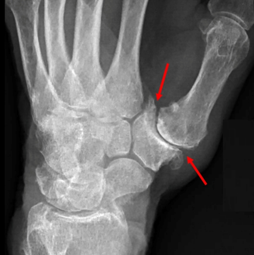 治療上,初期的病患經過充份休息及拇指加強型護具固定,大多會自行緩解,配合復健及使用消炎藥物緩解疼痛。但倘若關節發炎至退化的程度,基底關節開始出現腫脹、變型或突出等狀況影響到日常生活,如寫字、抓握動作無力,此時的基底關節炎可能已發展至後期,更嚴重者會有疼痛加劇,疼痛影響睡眠及生活品質,就可能要進一步接受局部注射或手術治療。