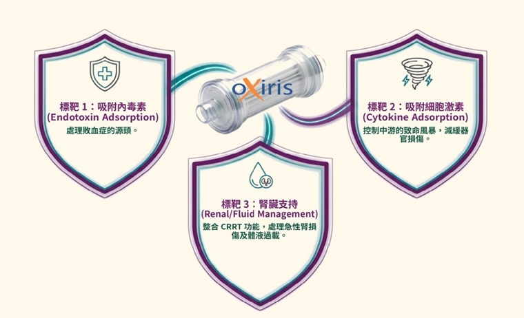 過去對於這類出現腎衰竭或休克的患者,我們常使用連續性腎臟替代療法(CRRT,俗稱洗腎)。然而,傳統洗腎主要針對水分與一般尿毒素的清除,對於分子較大的細胞激素或內毒素,清除效率有限,且速度往往不夠快,難以即時遏止高發炎狀態下的免疫風暴擴散。