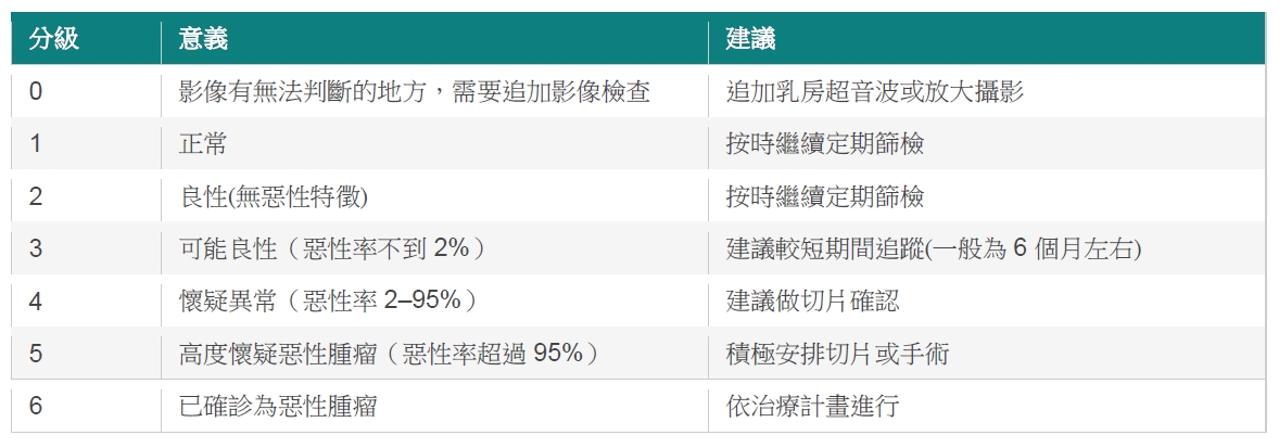 拿到乳房攝影報告,常常會看到「BI-RADS 分級」的字樣。這是醫師用來描述風險程度的分級系統, 會影響後續的處理方式