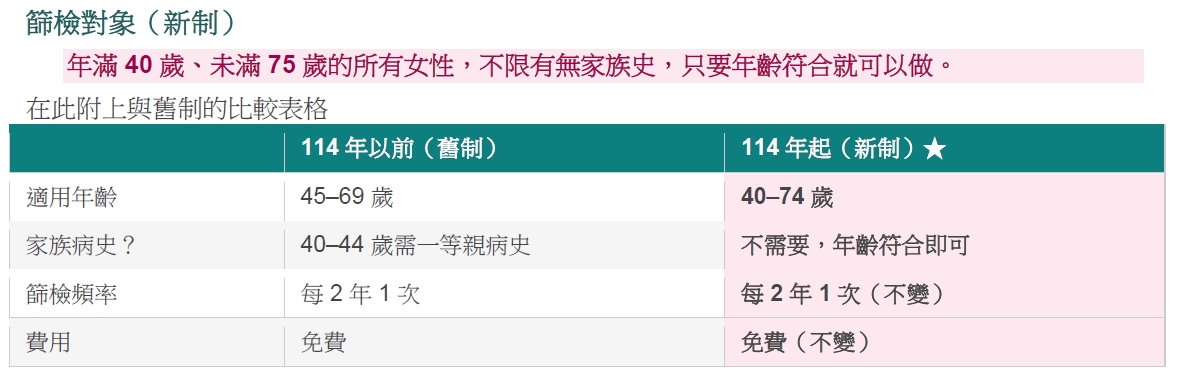 政府自 114 年(2025 年)1 月起大幅擴大了免費篩檢的資格,符合條件的女性可享每 2 年一次免費乳房 X 光攝影。