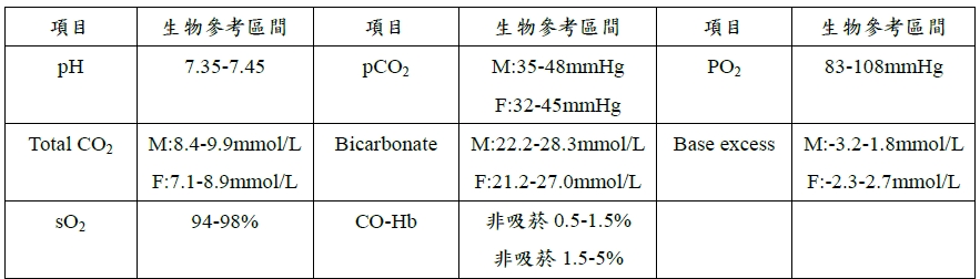 - 可用於評估循環及呼吸氣體交換能力,並用以推算血液中之酸鹼平衡狀態。