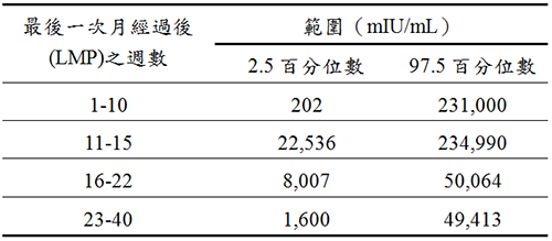 男性及未懷孕女性:<5 mIU/mL 懷孕初期:5 mIU/mL~25 mIU/mL 懷孕婦女: