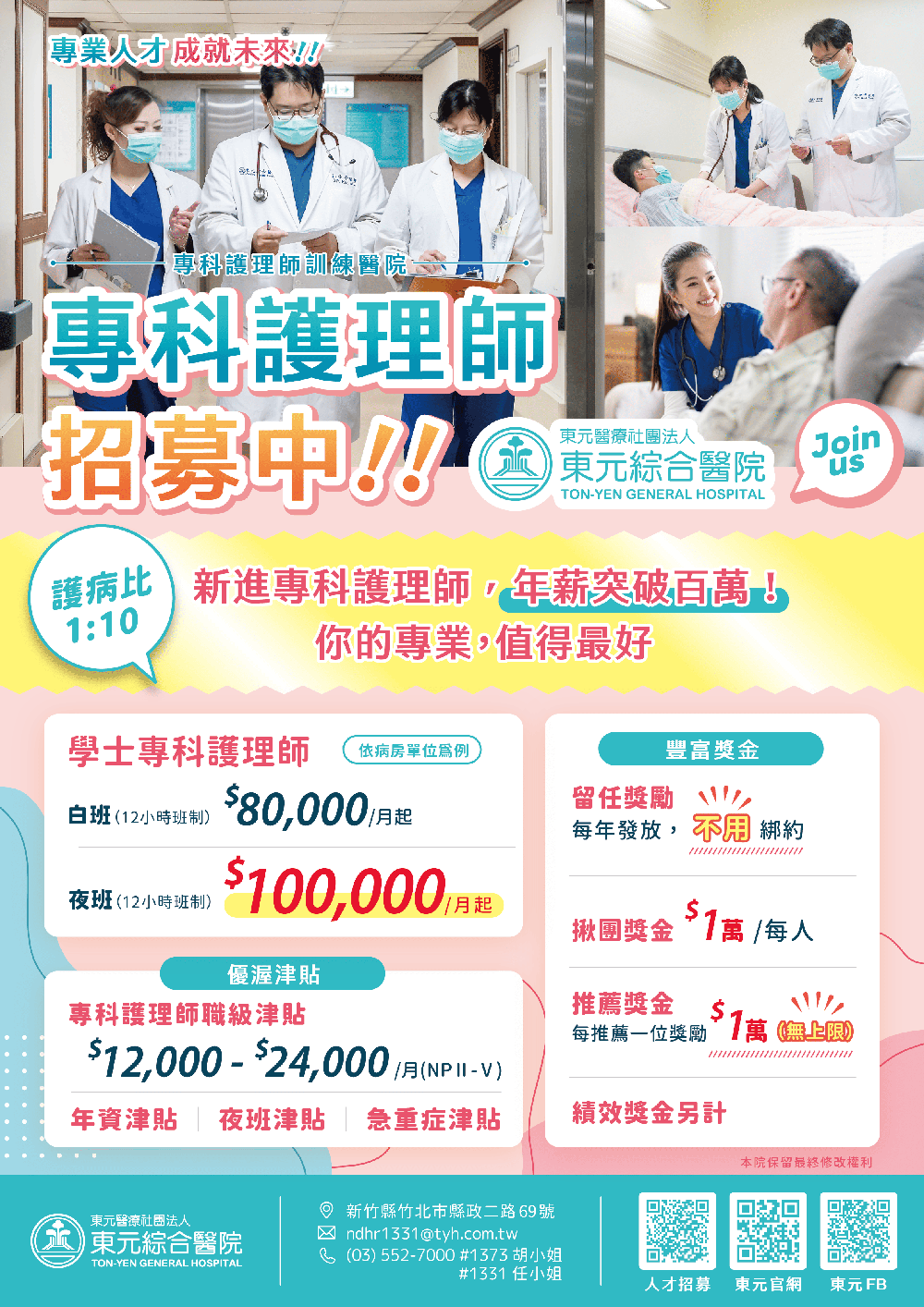 招募專線:任小姐 ndhr1331@tyh.com.tw 電話:03-5527000分機1331
